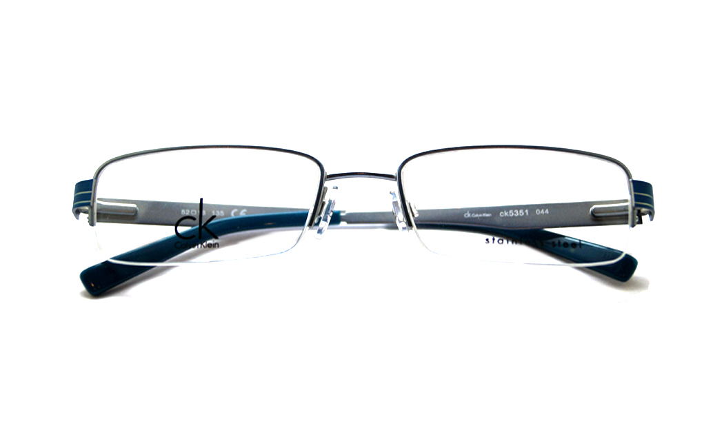 Half rectangular silvery gray metal rim with dark blue sheet spring side.